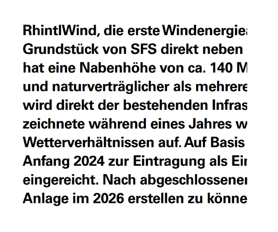 Der Marketingabteilung von SFS Group AG sei es gedankt - aber dieser Eintrag ist eine komplette Falschdarstellung der Fakten. Die geplante Anlage wurde während der Planungszeit immer höher, um überhaupt an etwas Wind zu kommen. Dabei wird, lösgelöst von allen Fakten, einfach übersehen, dass