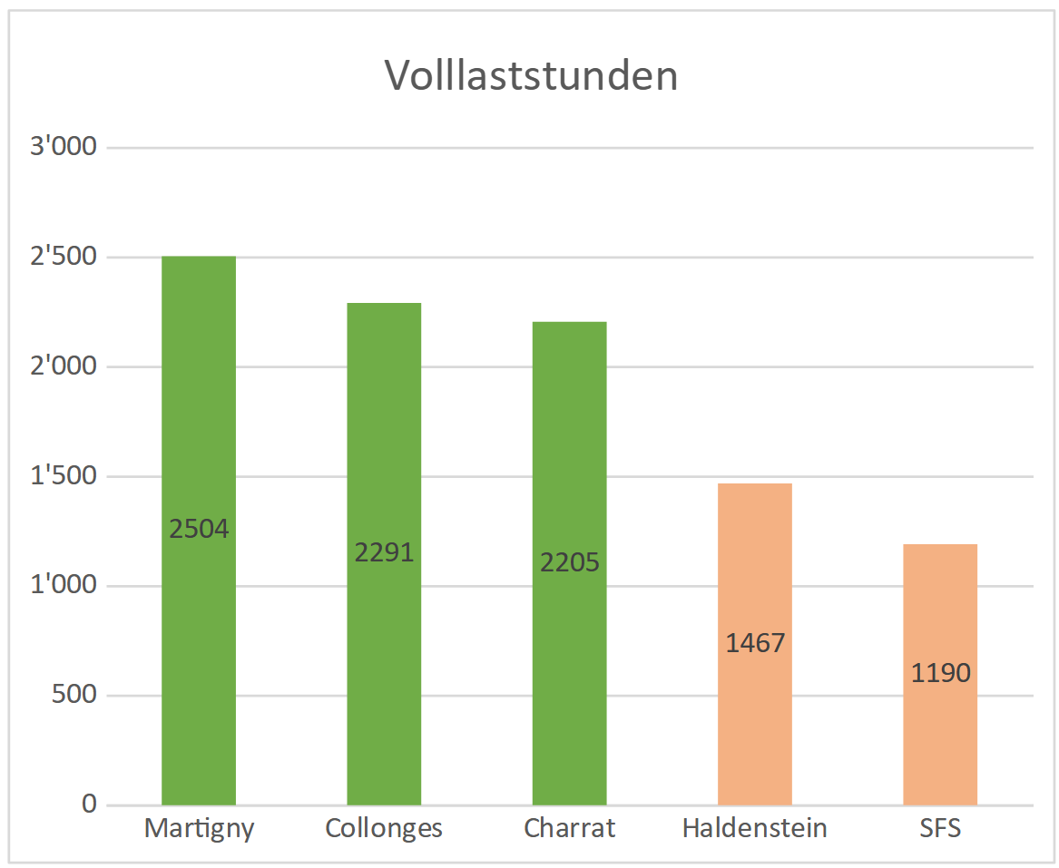 Die berechneten Volllaststunden im Verhältnis zu den möglichen Jahresstunden (8'760 h) ergeben einen Jahresnutzungsgrad von gerade mal 0.136 oder 13.6%. Der Vergleich mit anderen Windenergieanlagen in der Schweiz zeigt auf, dass diese Anlage nicht ansatzweise an die Volllastunden / den Jahresnutzungsgrad der Anlagen im Rhonetal kommt.