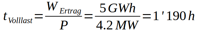 Tönt kompliziert, ist es aber nicht. Als Beispiel nehmen wir die geplante Anlage der Firma SFS Group AG. Mit dem publizierten Jahresertrag von 5 GWh bei einer installierten Leistung von 4.2 MW können die Volllastunden errechnet werden.
