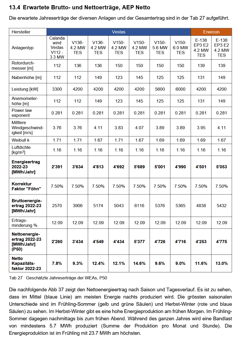 Es geht aber noch weiter. Der gesunde physikalische Verstand geht davon aus, dass mit dem Ertrag die elektrische Energie gemeint ist, die ins vorgelagerte Netz eingespiesen wird. So jedenfalls werden normalerweise Leistungen und Erträge ausgewiesen. Auch die statistischen Anlagedaten der bestehenden Anlagen sind so aufbereitet (https://wind-data.ch/wka/).