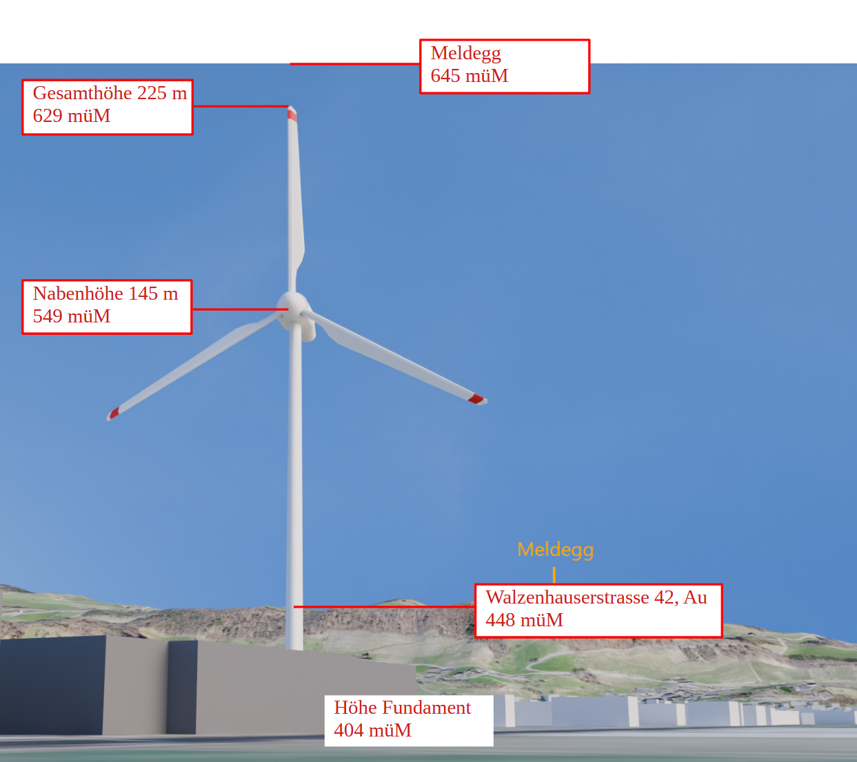 Im Gespräch mit Personen in der Gemeinde ist zudem vielen nicht klar, dass die Gesamthöhe der geplanten Windenergieanlage mehr als doppelt so hoch ist wie der eingesetzte Turm der Messanlage. Deshalb sind nachstehend Bildmontagen aufgeführt, die eindrücklich die Gesamthöhe aufzeigen.