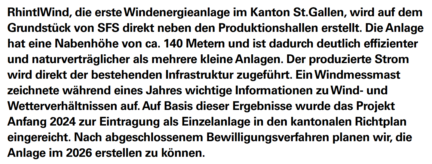 Die Windenergieanlage erfüllt die Anforderungen von Bundesrat Albert Rösti nicht. Eine Anlage gemäss seinen Angaben (2 TWh bei 200 Anlagen) muss eine elektrische Energie von 10 GWh pro Jahr ins Netz einspeisen können. Die Windenergieanlage von SFS, die übrigens die grösste geplante Anlage ist, ist auf rund 5 GWh ausgelegt.