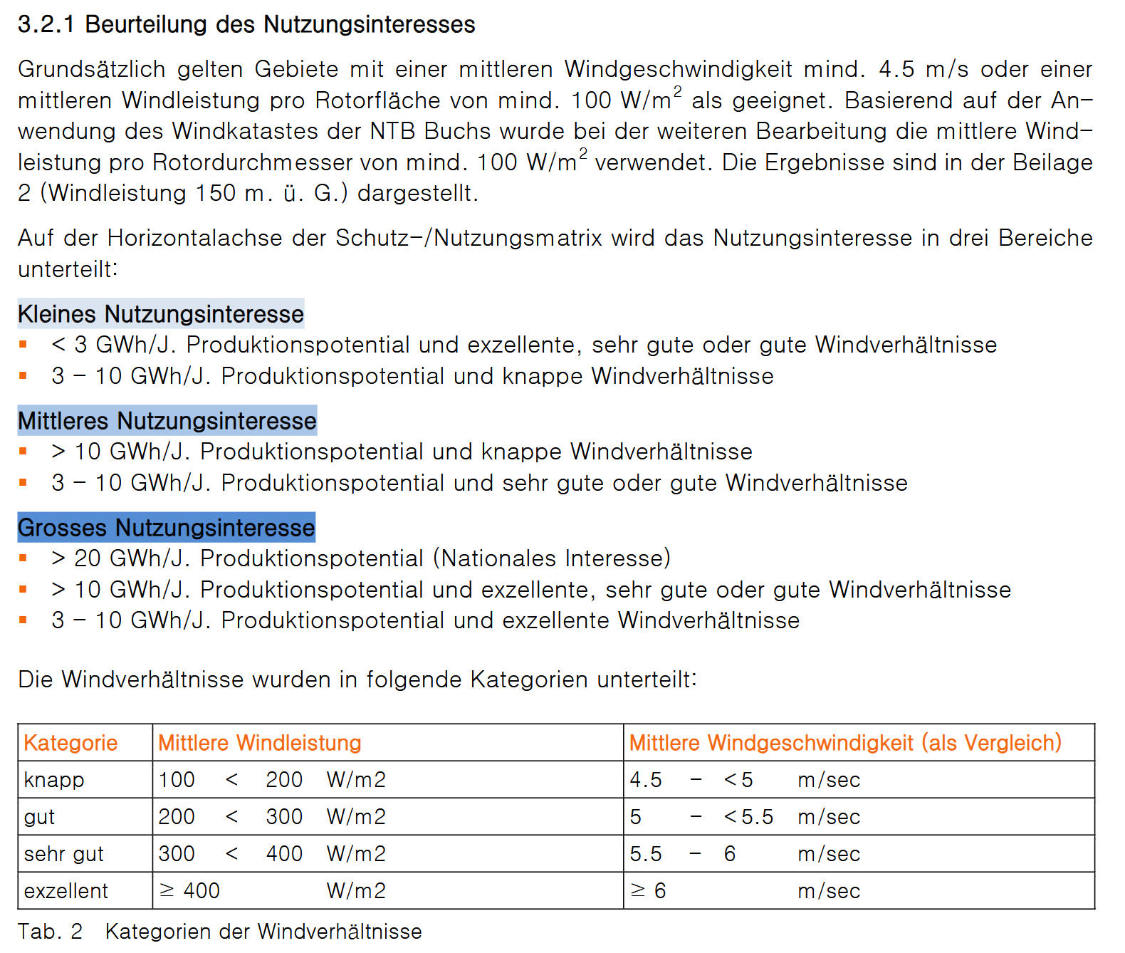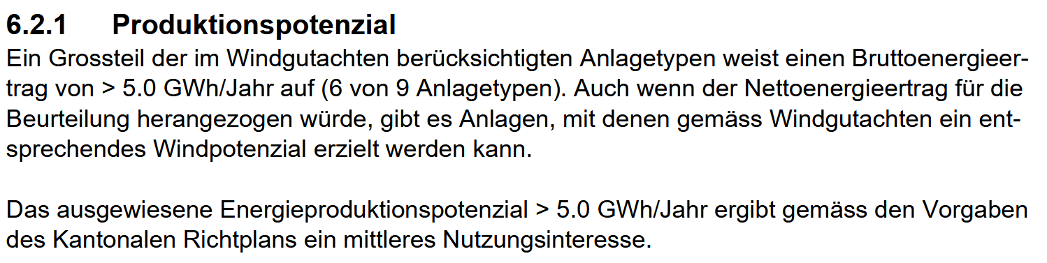 Bei der gemäss Machbarkeitsstudie ausgewiesener mittlerer Windgeschwindigkeit von 4.07 m/s auf der Nabenhöhe von 145 m ist seitens des Kantons kein Nutzungsinteresse, da die Minimalwerte von Windgeschwindigkeit und Windleistung nicht erreicht werden. Das Gebiet ist ungeeignet!