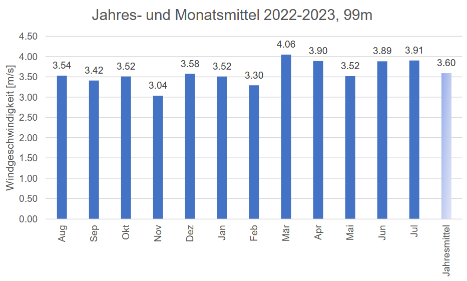 Die Messung hat ergeben, dass in den Wintermonaten Oktober bis Februar unterdurchschnittliche Windgeschwindigkeiten vorherrschen.