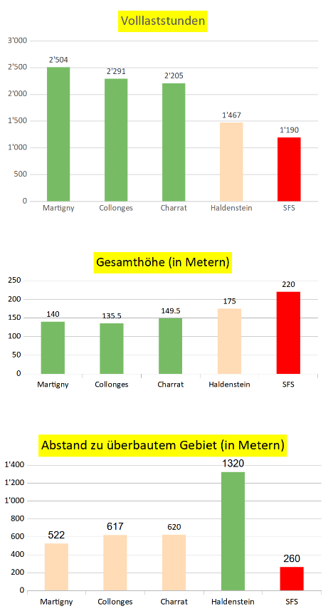 Aus den Anlagedaten ist ersichtlich, dass die Anzahl der Volllaststunden bei den drei Anlagen im Rhonetal rund doppelt so gross ist wie bei der geplanten von SFS. Das bedeutet, dass auch ein enormer Ressourcenverschleiss (Fundament, Mast, Kabine, etc.) für eine ineffiziente Anlage vorhanden ist.