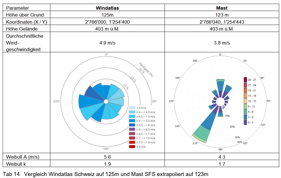 Ebenfalls in der Machbarkeitsstudie ist erläutert, dass der von BFE (Bundesamt für Energie) und Suisse Eole in Auftrag gegebene und von der Firma Meteotest AG erarbeitete «Windatlas Schweiz» signifikant von den Messungen abweicht. Bei der ausgewiesenen Messung auf 125 m Höhe sind die gemessenen Windgeschwindigkeiten rund 23% tiefer als im Windatlas.